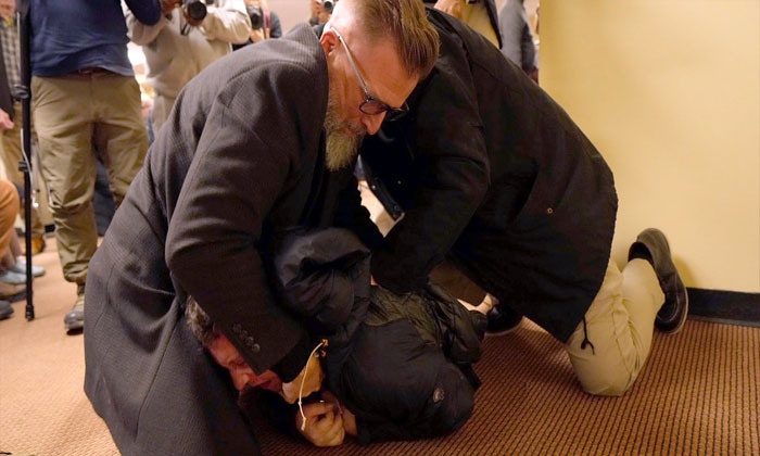 A man was restrained and removed from a public meeting in Minneapolis after allegedly spraying an unknown substance toward U.S. Representative Ilhan Omar during a town hall event Tuesday evening. Video from the scene shows the individual being tackled to the ground by attendees as Omar was speaking to constituents.