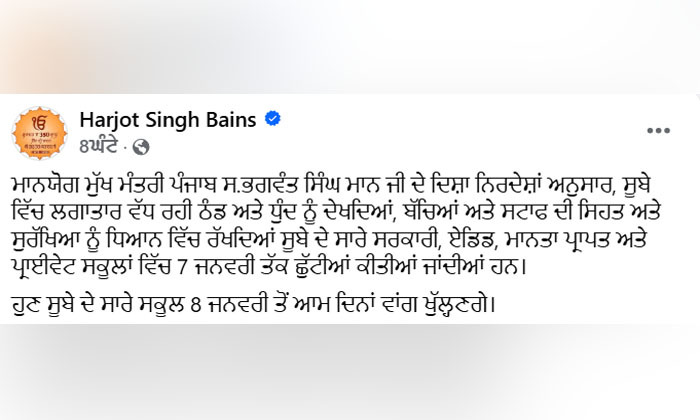 Education Minister Harjot Singh Bains said the move was taken on the directions of Chief Minister Bhagwant Singh Mann, with the health and safety of students and school staff being given top priority. Schools will now remain closed until January 7 and will reopen as usual from January 8.
